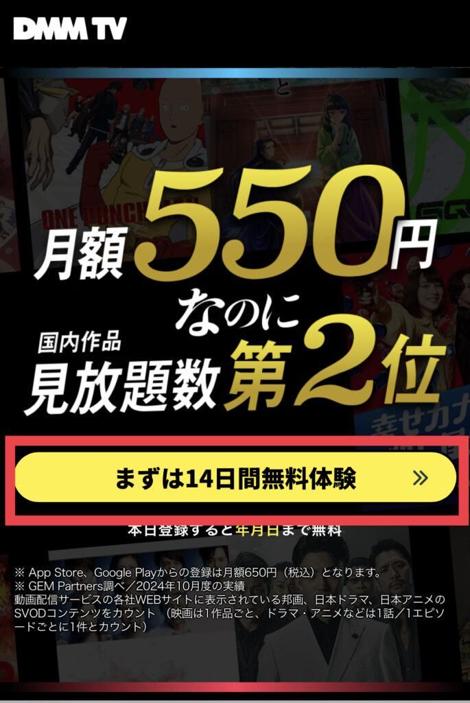 公式では、初回14日間無料、Webは月額550円、App Store・Google Play経由は650円と案内されています。